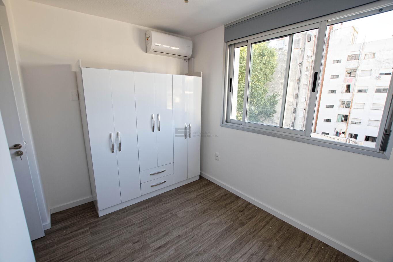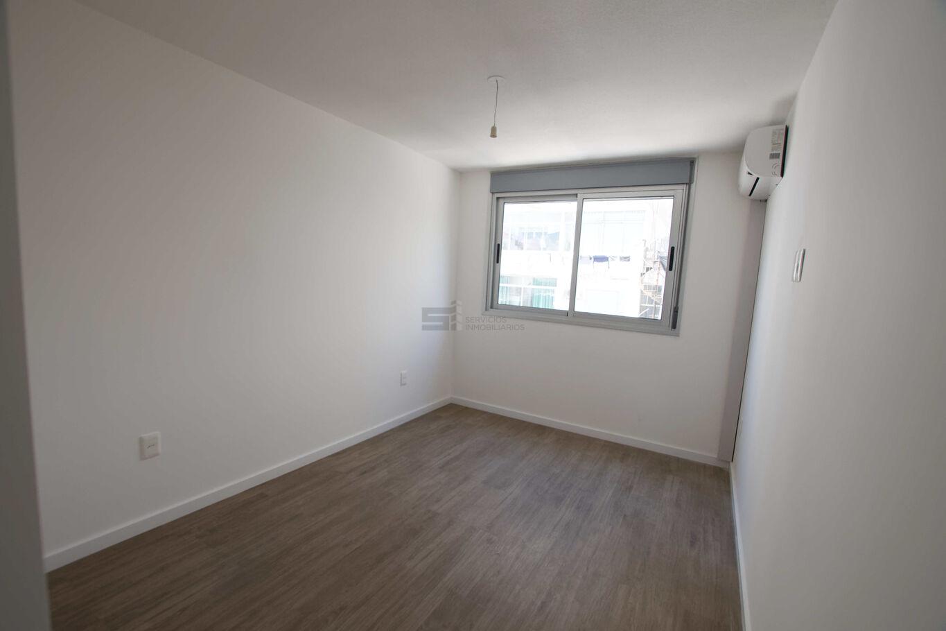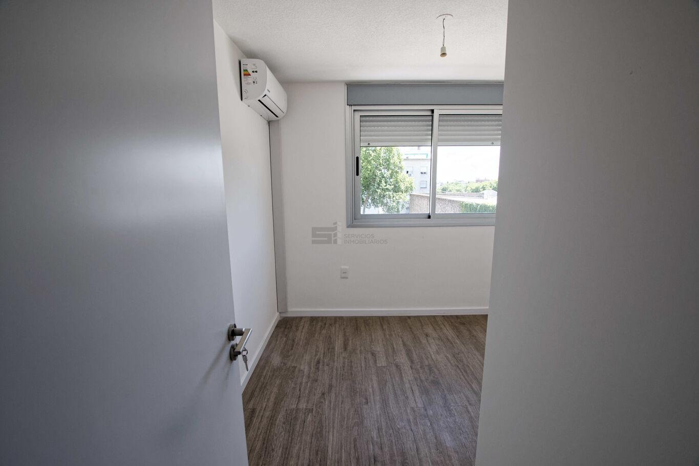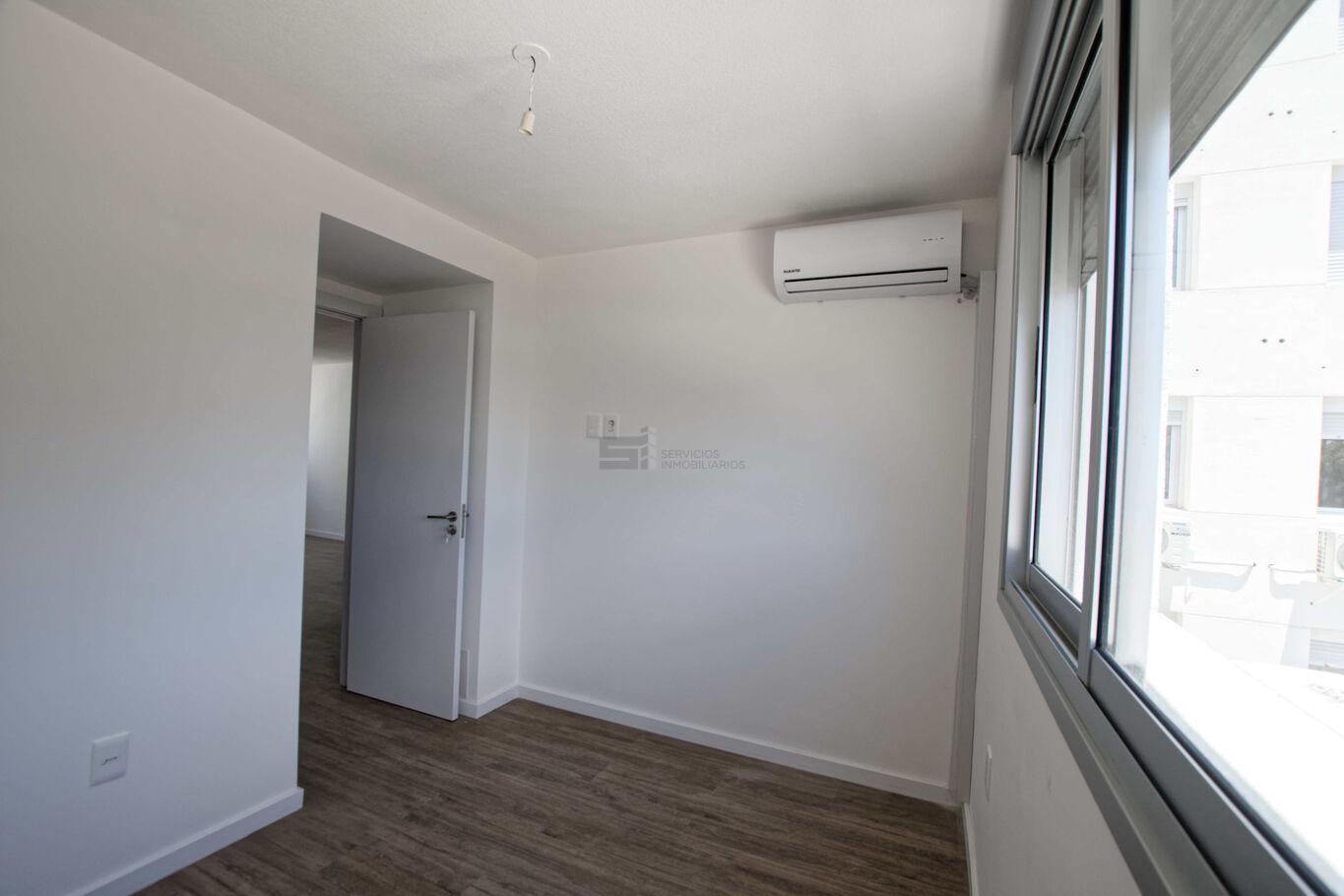 El apartamento dispone de living comedor con cocina integrada, equipada con campana extractora. Los dos dormitorios cuentan con placares y la unidad tiene aire acondicionado instalado en cada ambiente. El baño es completo y funcional.