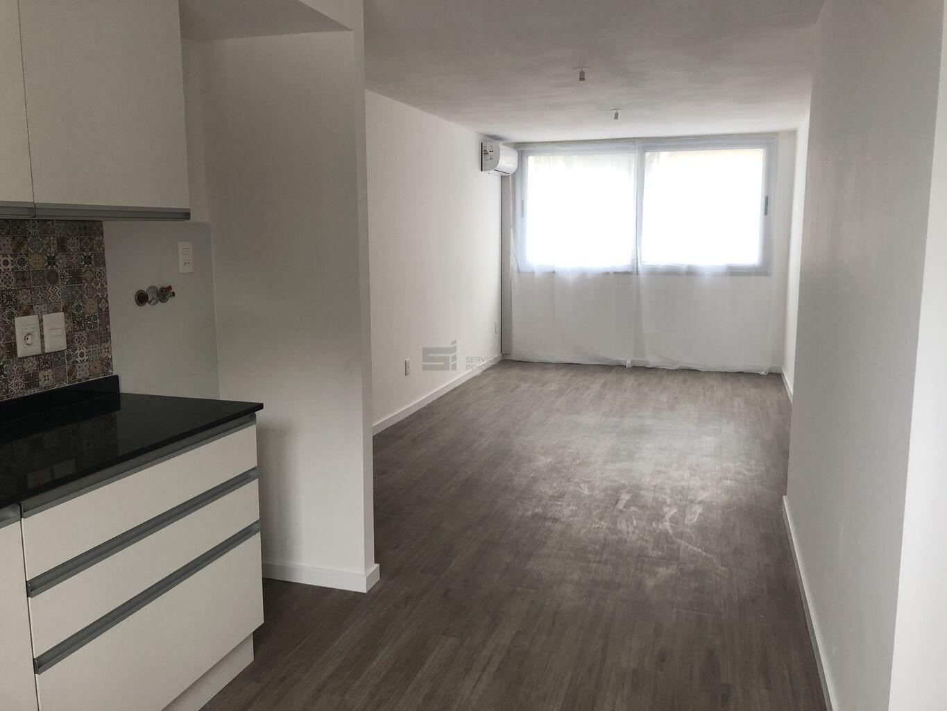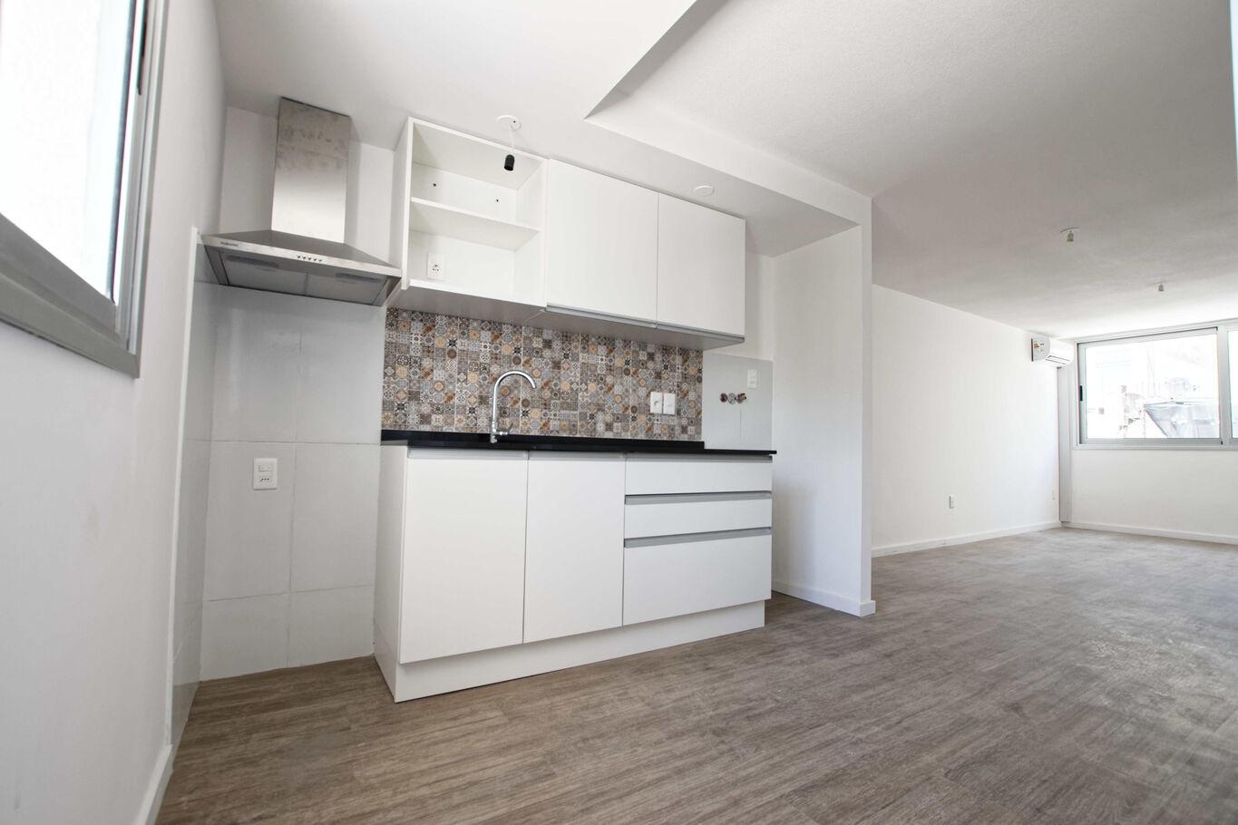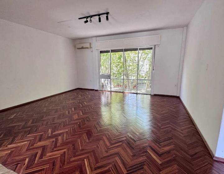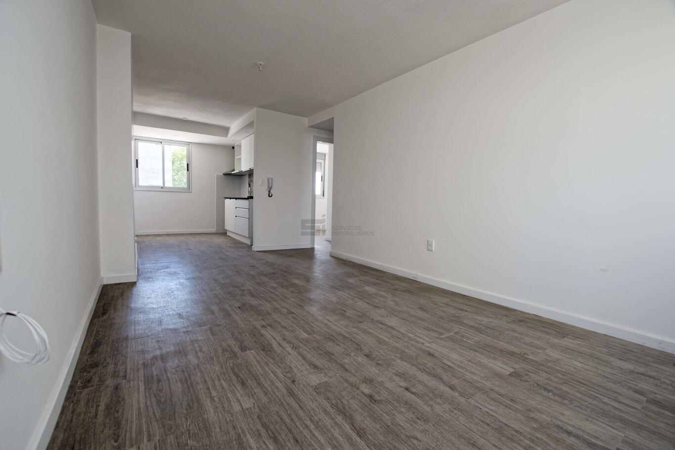 El apartamento dispone de living comedor con cocina integrada, equipada con campana extractora. Los dos dormitorios cuentan con placares y la unidad tiene aire acondicionado instalado en cada ambiente. El baño es completo y funcional.