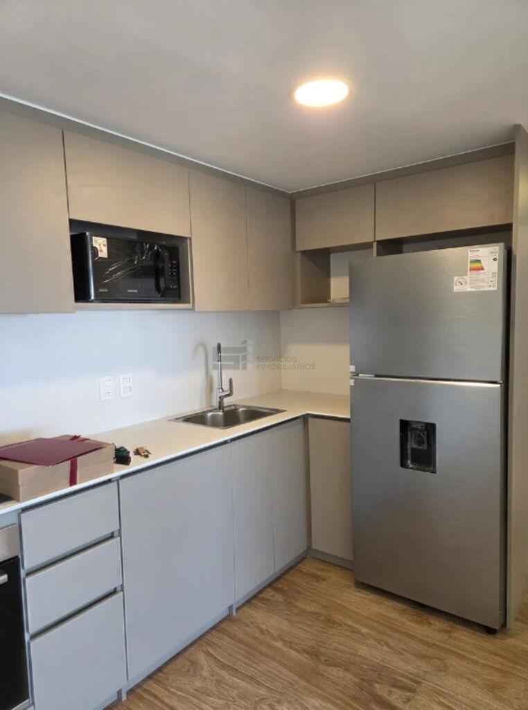 Cocina equipada con electrodomésticos a estrenar: anafe Bosch, horno eléctrico, microondas, heladera y calefón.
