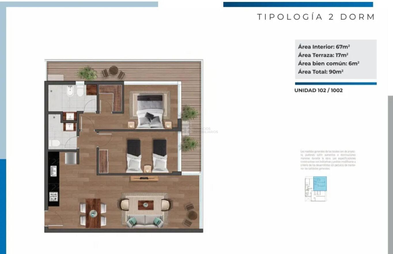 2 dormitorios, 2 baños y 2 garajes.