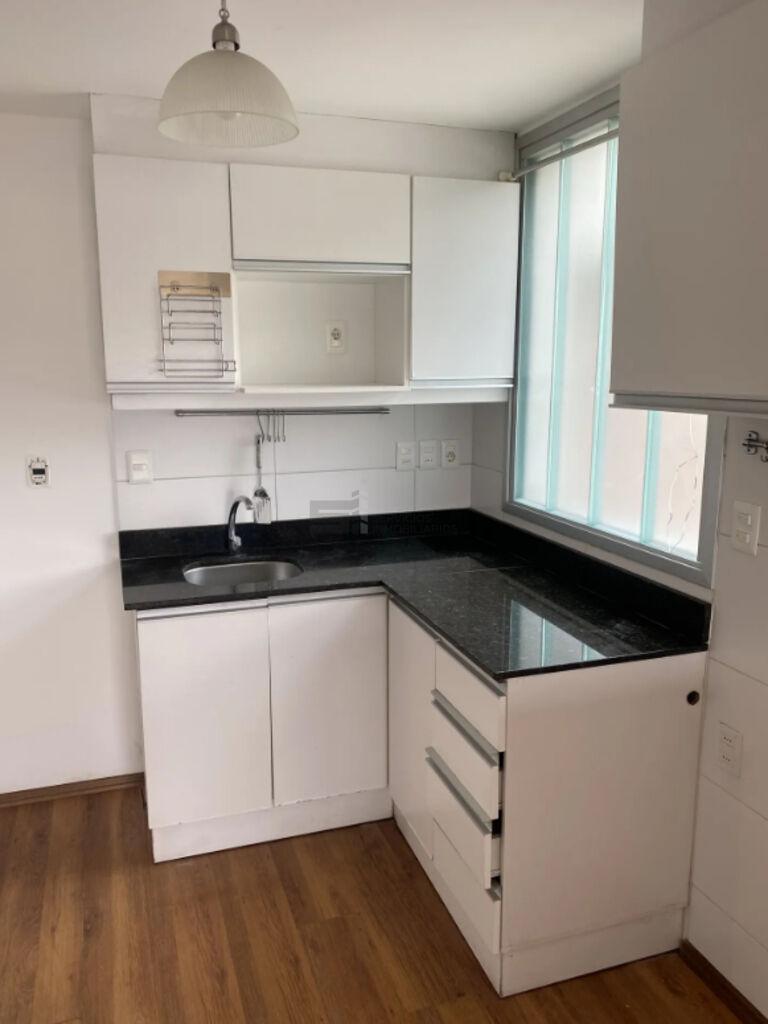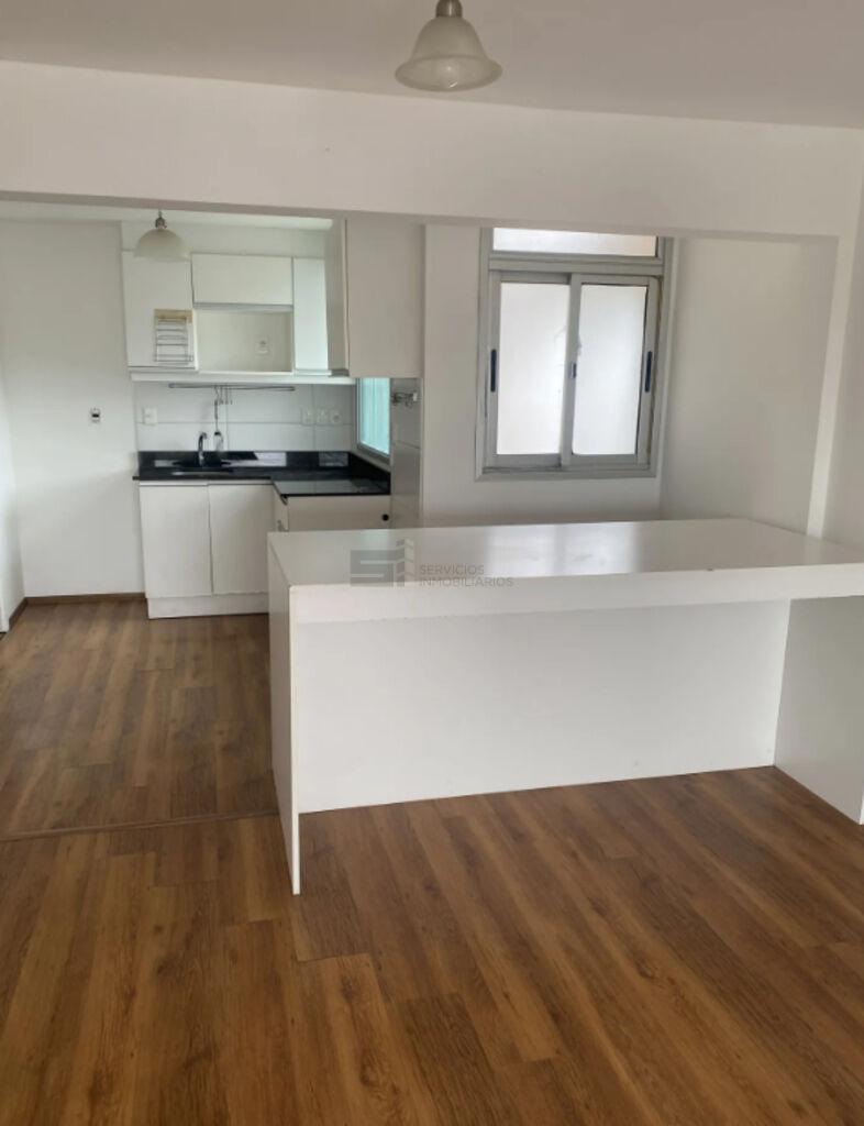 Cocina integrada con placares y una isla que funciona como mesa o barra, con estantes. Baño con porcelanato y ducha con mampara. Aire acondicionado.
